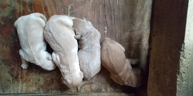 | ★ゴールデンドゥードル子犬最新情報★ ・誕生日:2015年7月26日 ・性別:オス4頭、メス2頭 ・毛色:クリーム ・価格:全てご家族決定しました。 ・ワクチン代:5,000円 ・空輸料金:旭川空港からの直行1万円、経由便1.5万円 ・産地:北海道 ・保証:無償保証付き、詳細は⇒生体保証 ・両親:父親スタンダードプードル、母親ゴールデンレトリバー ・備考:目もようやく開き母乳を良く飲み順調に成長しています。ゴールデンドゥードルは抜け毛が少なく優しく賢い犬種です。年配の方や小さいお子さんとも相性がいいです。顔はゴールデン寄りで、被毛はウェーブがかかりプードルに近いミックス犬です。子犬を展示しているペットショップと違い母乳で免疫力をつけ他の子犬と交わっていませんので伝染病の心配の無い健康な小犬達です。お届けは生後55日前後を予定しています。 (写真は8/30撮影) お問合せの際は氏名・住所・電話番号を明記して下さい。 お問合せはこちらから⇒info@dogdepo.net 090-2648-5923(ドッグデポ・有村) |